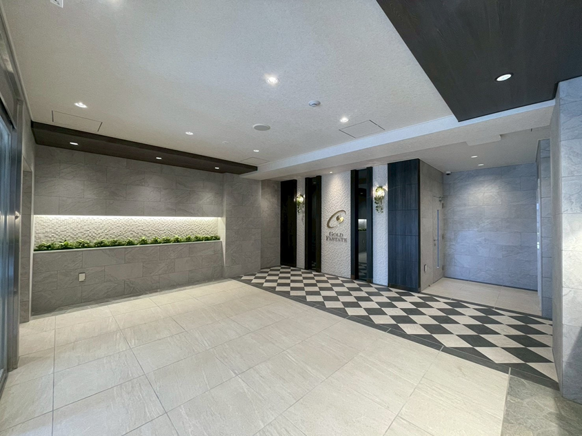 エントランスは石調の壁や木目、フェイクグリーンを用いた落ち着きのある空間とし、入居者や訪問者を心地よく迎えるデザインとしています。